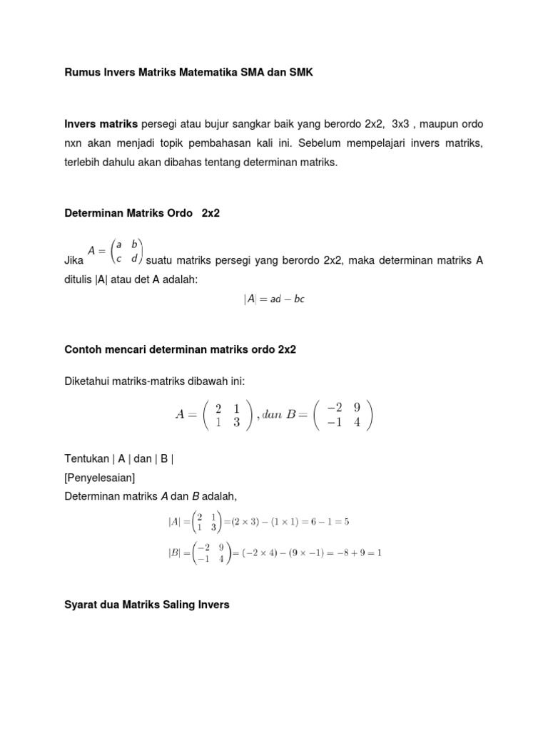 Contoh Soal Invers Matriks Ordo 2x2 Dan Jawabannya ...